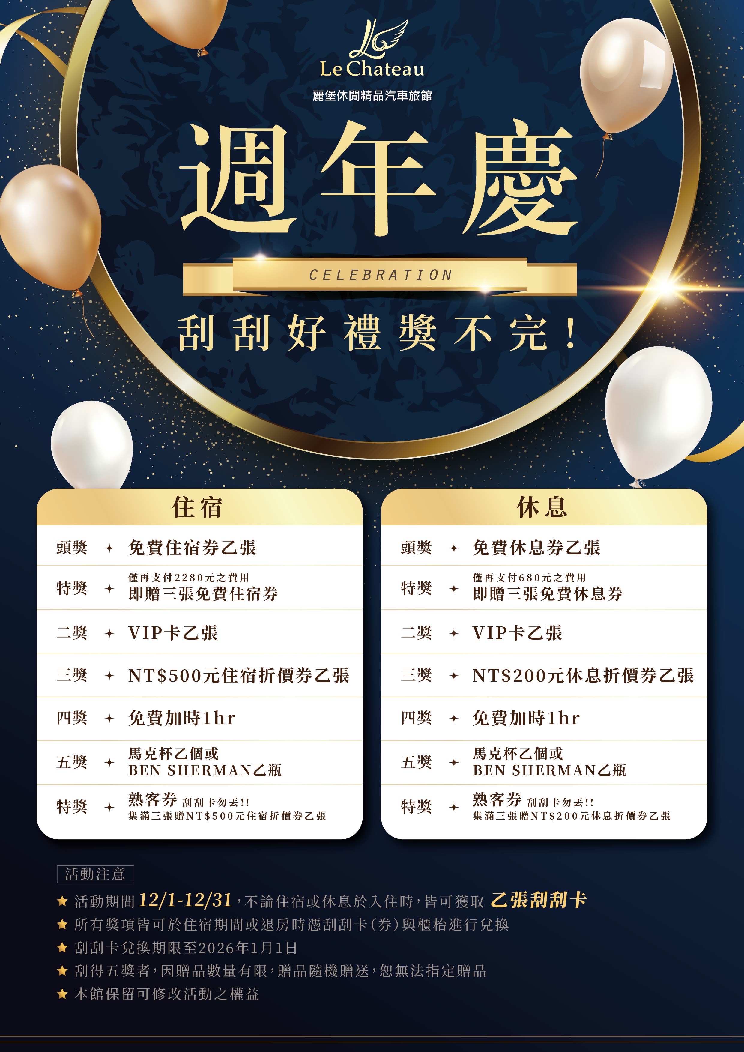 優惠資訊11.29.2025 週年慶 「歲末年終週年慶」~🎊 「刮刮好禮獎不完」~🎊 12/1~12/31期間,無論住宿或休息,皆可參加週年慶刮刮樂活動,機不可失,還不快來刮出你的好運氣! ⚠️活動注意: 1)活動期間12/1-12/31,不論住宿或休息於入住時,皆可獲取乙張刮刮卡 2)所有獎項皆可於住宿期間或退房時憑刮刮卡(券)與櫃枱進行兌換 3)刮刮卡兌換期限至2026年1月1日 4)刮得五獎者,因贈品數量有限,贈品隨機贈送,恕無法指定贈品 5)本館保留可修改活動之權益