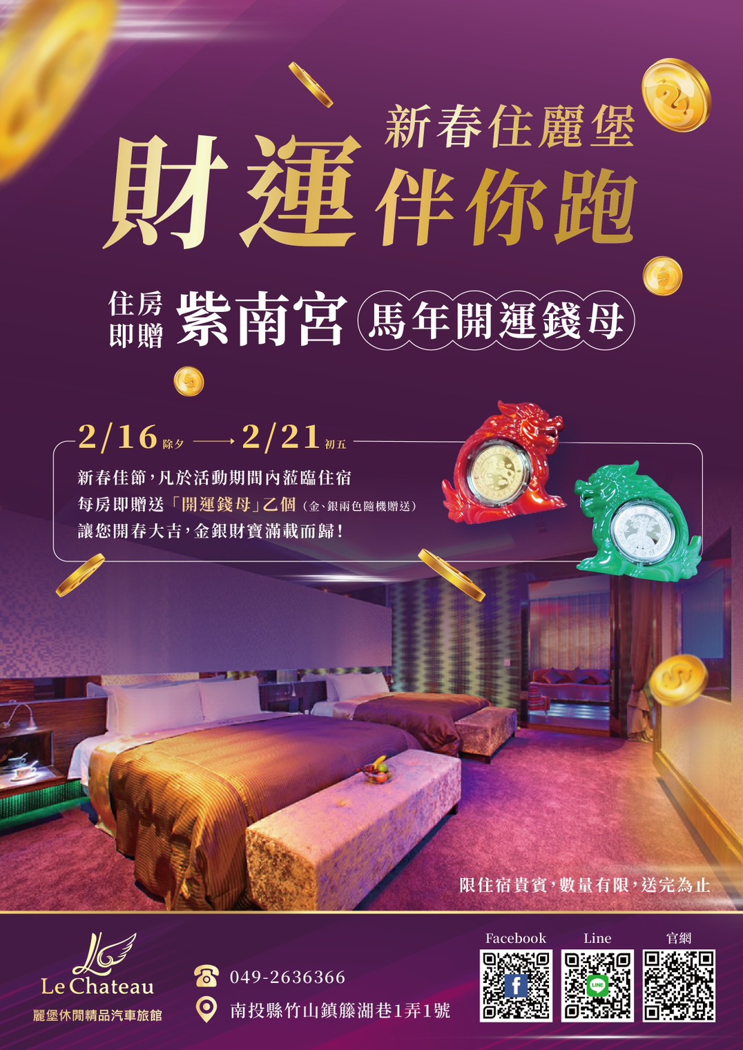 2026年春節活動01.21.2026 新春住麗堡,財運伴你跑! 🐴金馬來送寶~ 💰財運伴你跑~ 🧨新春住麗堡~ 🪙錢母迎春到~ 新春佳節2/16-2/21,凡於活動期間內蒞臨住宿,每房即贈送「馬年開運錢母乙個」